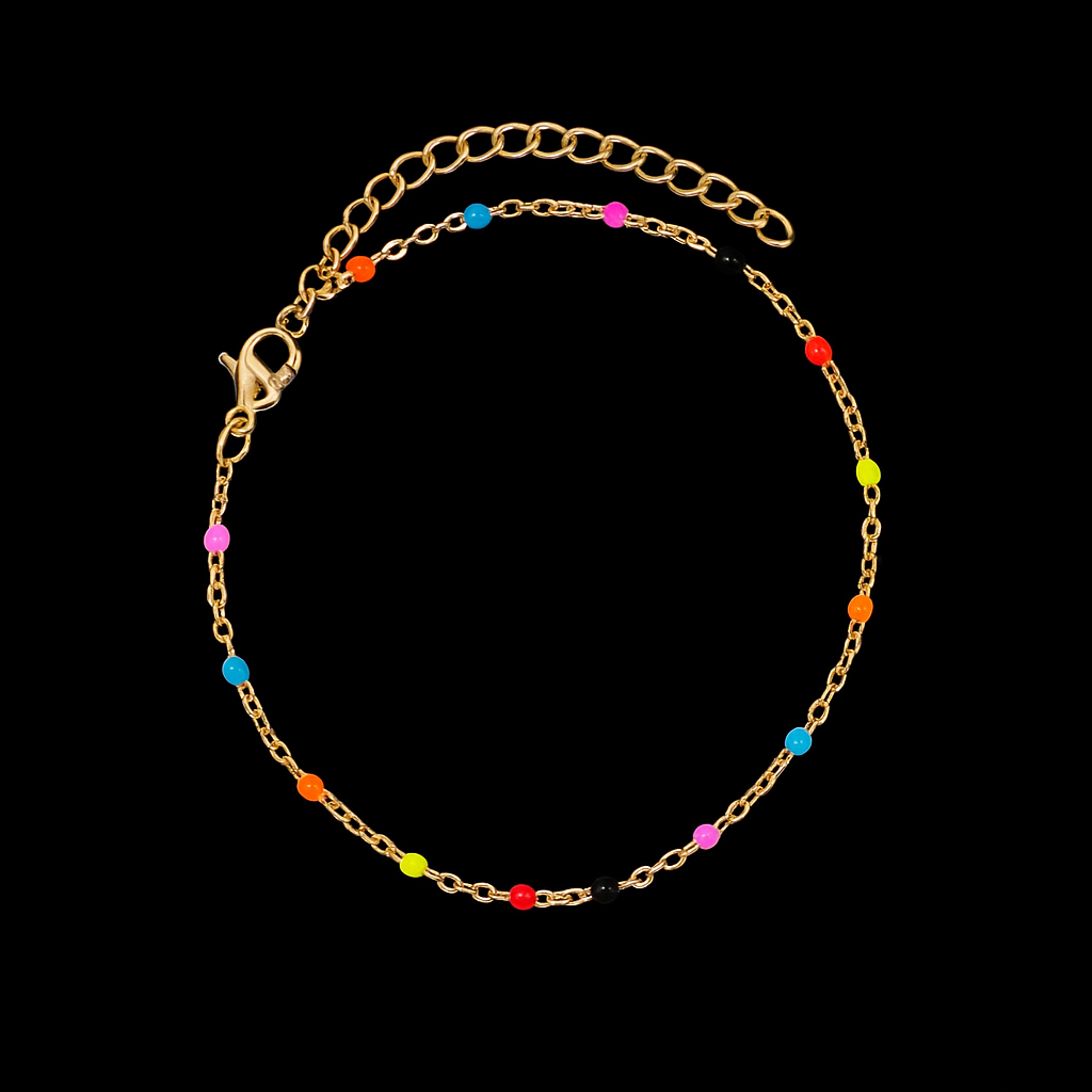 Add a splash of color to your look with this elegant gold chain bracelet, delicately adorned with vibrant multicolor beads. Crafted from high-quality gold-plated alloy, this lightweight and adjustable bracelet is designed to complement any outfit—whether casual or chic. The colorful beads bring a fun, youthful charm, while the polished gold links offer timeless sophistication.
